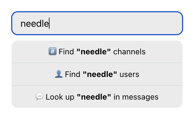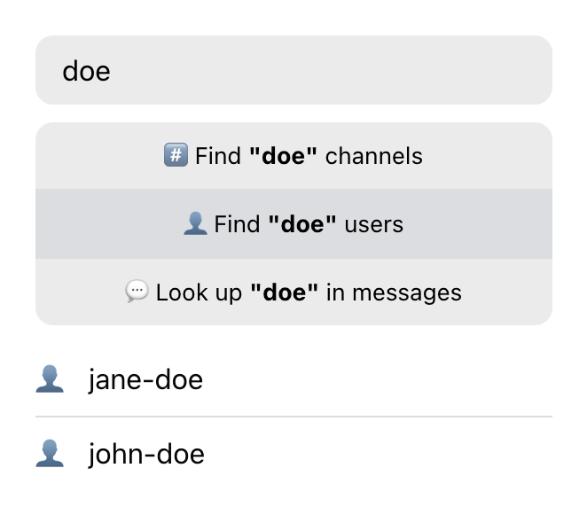 Channel search is used to find channels based on a query that includes user input. Depending on your needs, it can be used to either find existing conversations, start new ones, or do both.
