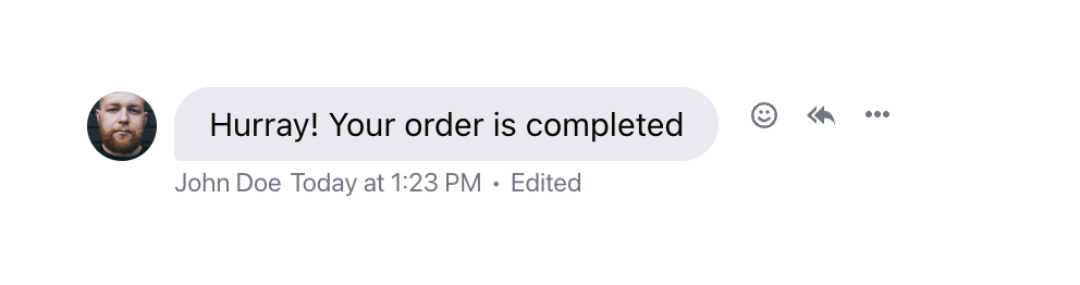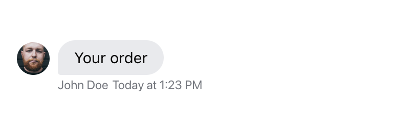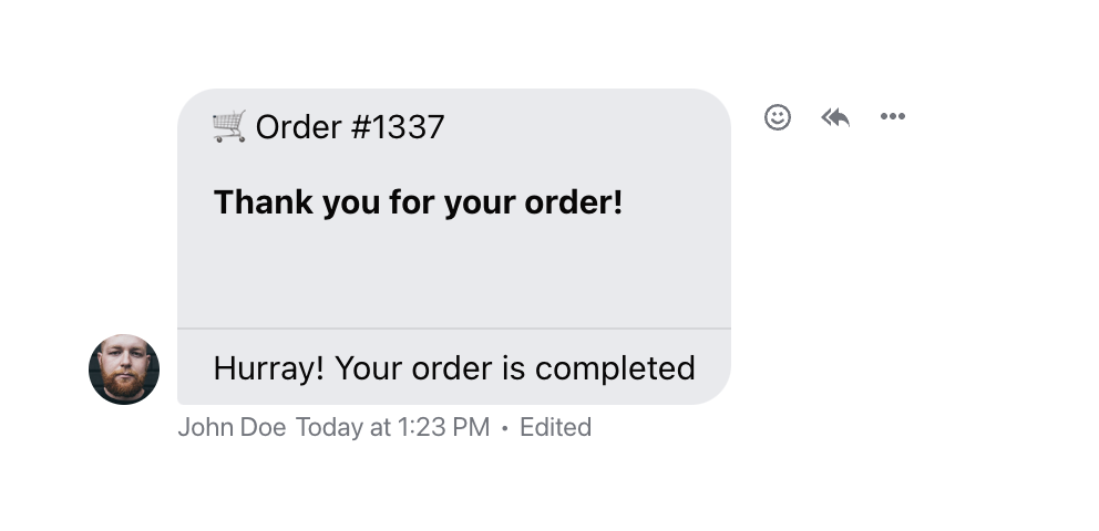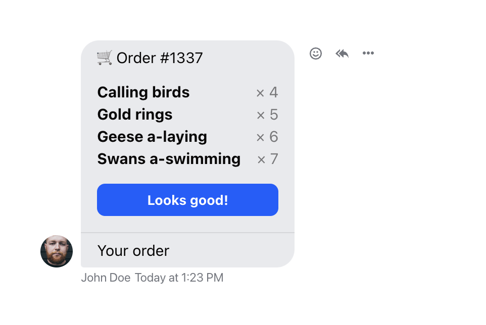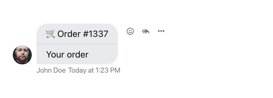 First, let's send a message with a custom attachment type. An attachment can have any JSON payload. In our case, the payload contains the order number: