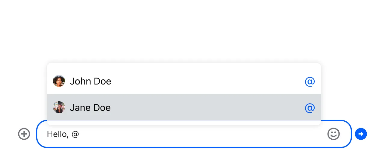 The default message input component provided by the SDK supports this out of the box. When a trigger character is typed into the message input, a list of suggested options appears: