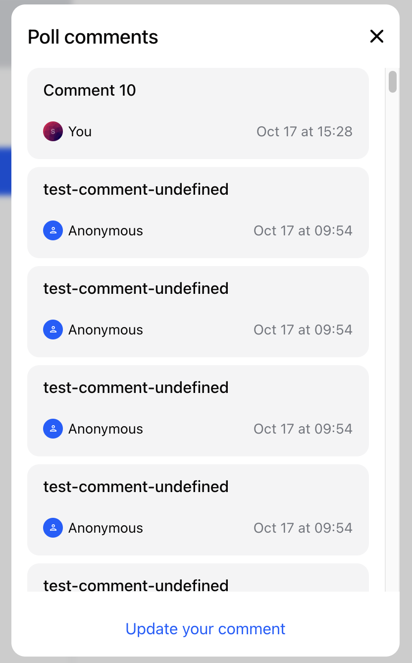 | Add or update own comment | poll is not closed and poll.allow_answers === true | AddCommentForm |