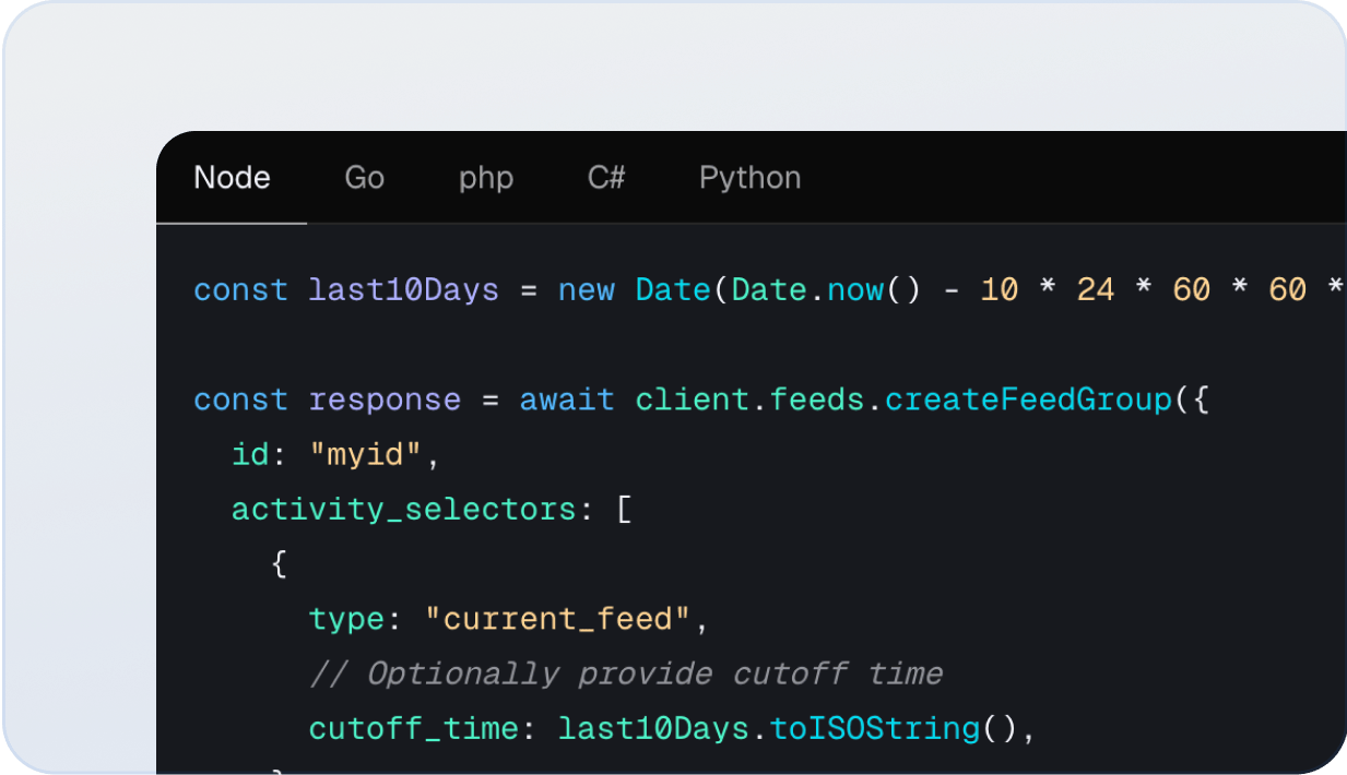 Prototype fully-featured social feeds in days with client and server-side SDKs and docs .