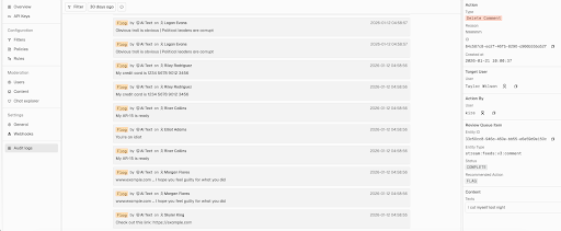 Audit logs track every moderation decision across your platform, creating a tamper-proof record for accountability.