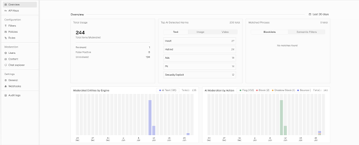 - Moderated Entities by Engine → Distribution of flagged content by detection engine (AI Text, AI Image, AI Video, Semantic Filters, Blocklist, etc.).