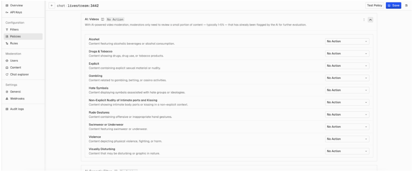 Stream’s AI video rules analyze video uploads for unsafe or inappropriate visuals. Like image moderation, the system scans the actual video frames not just metadata to detect harms.