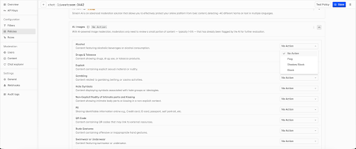 Moderation rules are the building blocks of policies. By combining AI detection (across text, images, video, and semantics) with blocklists and regex filters, you create a system that balances speed, context, and precision.