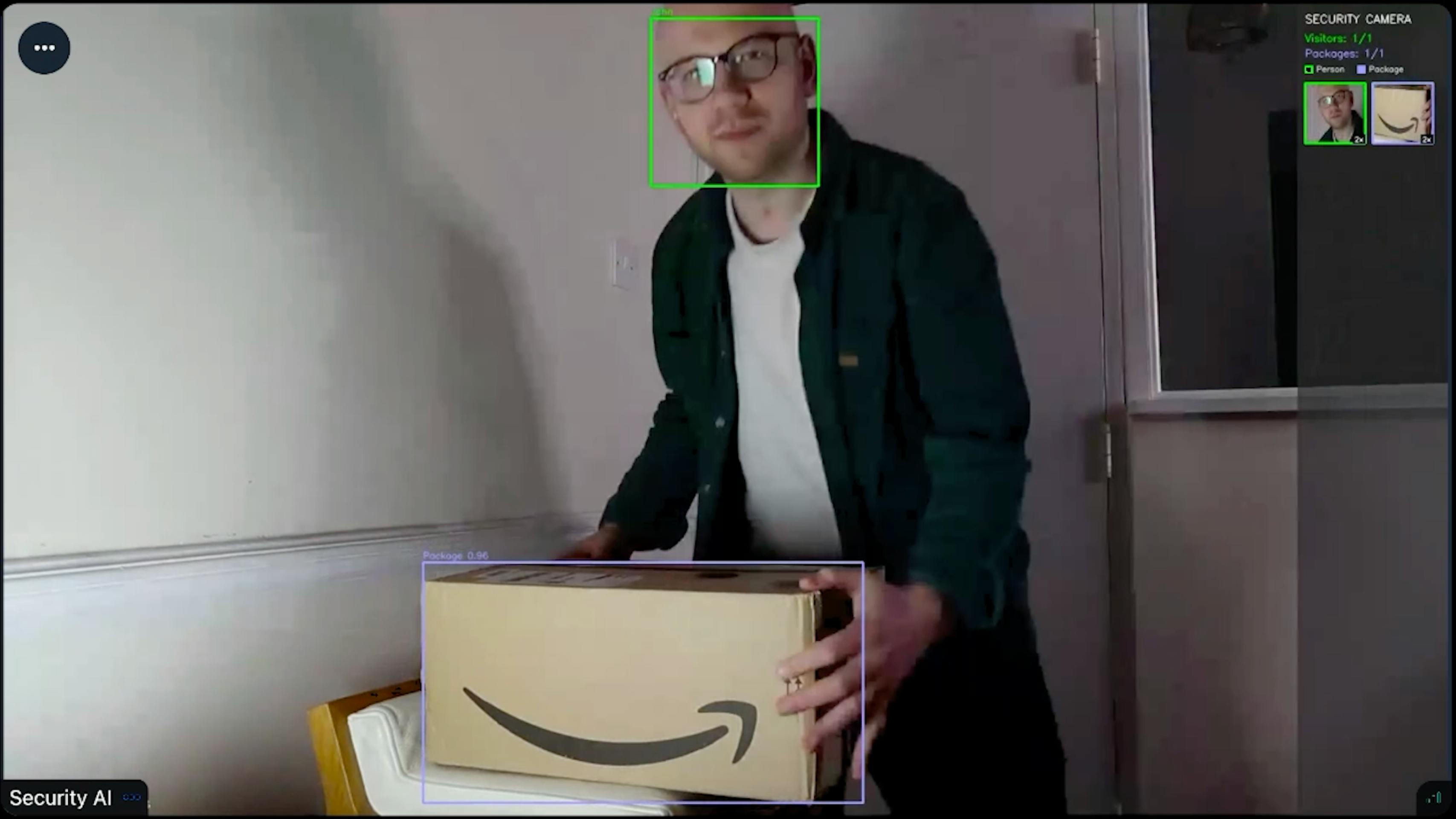 Facial recognition, package detection, automated package theft response, and posting to X.