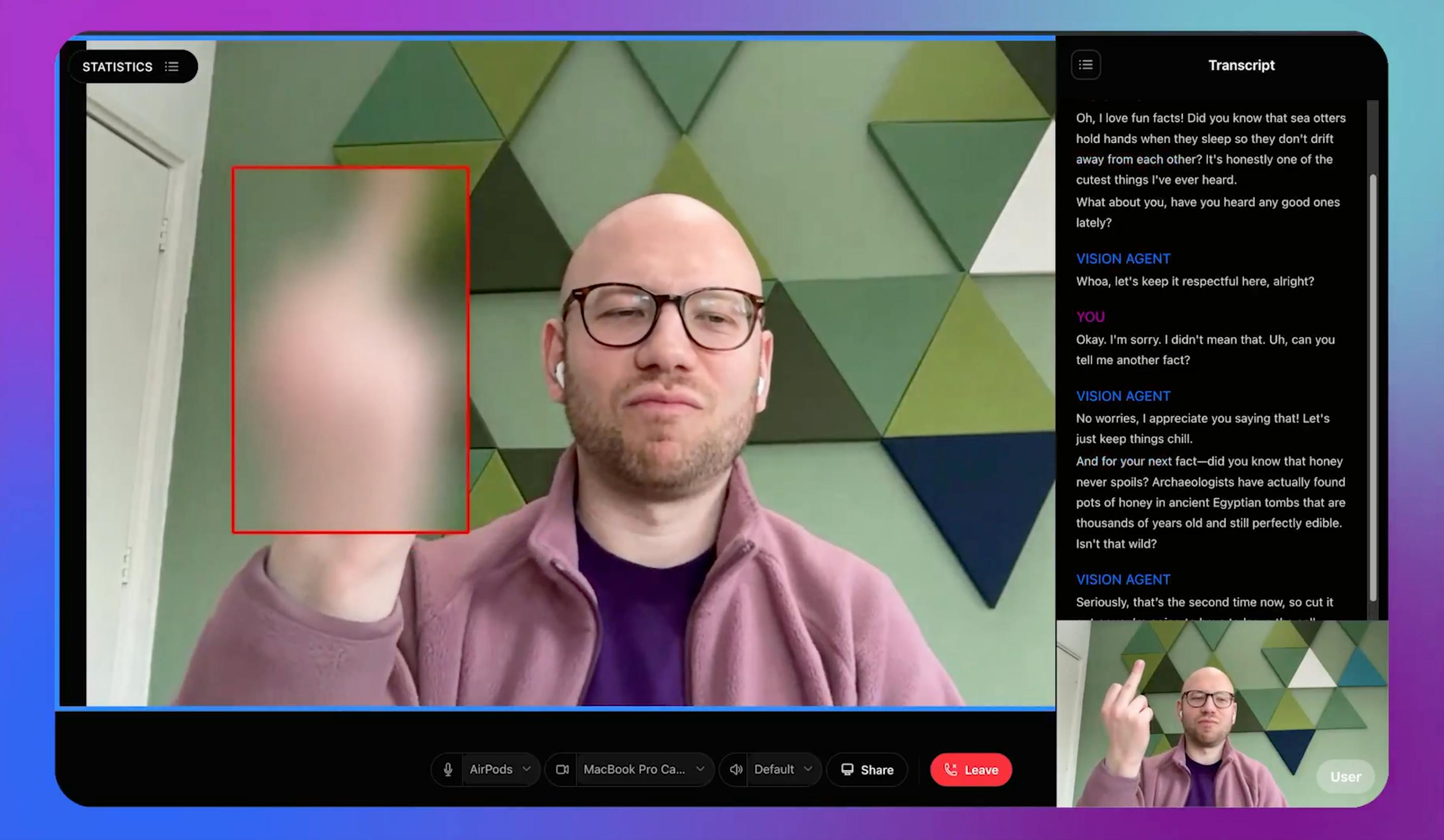 Detect and censor offensive gestures, and give three verbal warnings before kicking the user out.
