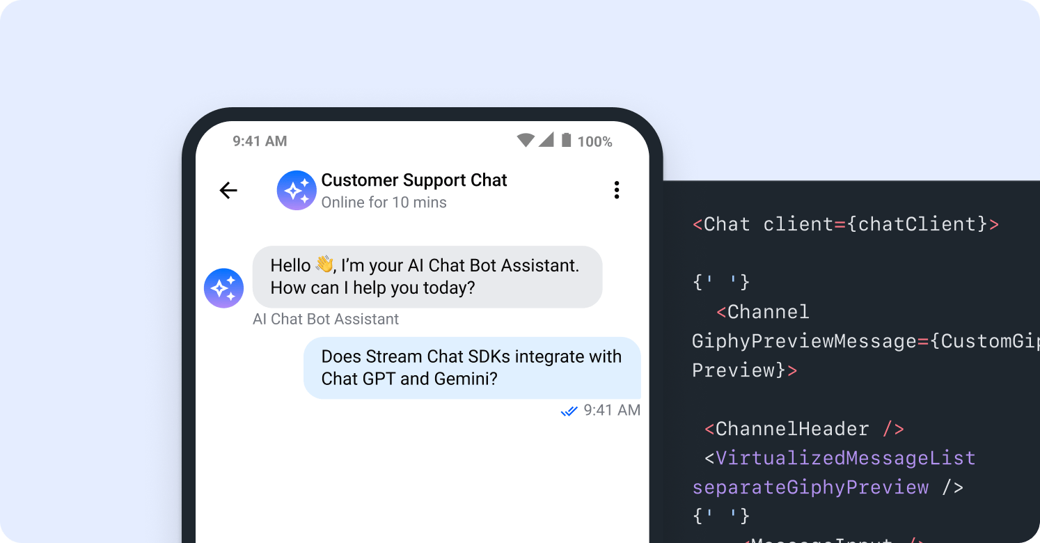 Integrate AI experiences into your messaging app using Stream, OpenAI's ChatGPT, or Google's Gemini to build a rich, engaging, tailored UX across all platforms and SDKs.